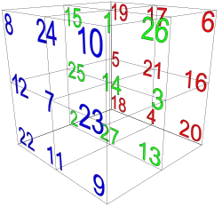 - Hendricks, John R., The Pan-3-agonal Magic Cube, Journal of Recreational Mathematics, 5:1, 1972, pp51–52
