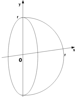 O volume de uma semi-esfera é igual a soma dos volumes de discos, concêntricos e de espessura infinitesimal, empilhados ao longo do eixo x, de x = r (y = 0) até x = 0 onde o disco tem raio r (y = r).