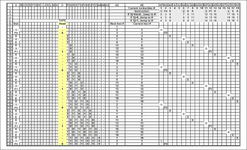 A "execução" completa do castor ocupado 3-estados. Os resultantes do estados de Turing (o que Turing denominados "configurações-m" & mdash; "máquinas-configurações") são mostrados em destaque em cinza na coluna A, e também sob instruções da máquina (colunas AF-AU))