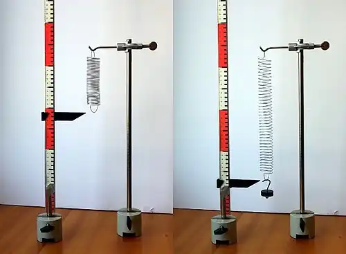 Uma mola elástica esticada ou comprimida exerce uma força dirigida na direção e sentido que faz regressar a mola à sua forma normal. O módulo da força exercida pela mola é diretamente proporcional à elongação da mola. Se pendurarmos um peso , a mola é esticada até ficar numa posição em que a força elástica equilibra o peso. Duplicando esse peso duplica-se a elongação.