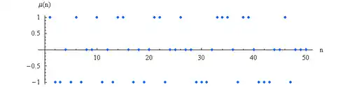 - μ(n) = 1 se n não tem como divisor um outro número natural ao quadrado e é decomposto em uma quantidade par de números primos