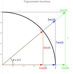 Seja o raio obtido pela rotação de um ângulo θ da metade positiva do eixo x (rotação anti-horária para , e rotação horária para ). Este raio intercepta o círculo unitário no ponto . O raio , estendido para uma reta se necessário, intercepta a reta da equação no ponto , e a reta da equação no ponto . A reta tangente ao círculo unitário no ponto A, é perpendicular a , e intercepta os eixos y e x nos pontos e . As coordenadas desses pontos fornecem os valores de todas as funções trigonométricas para qualquer valor real arbitrário de θ da seguinte maneira.