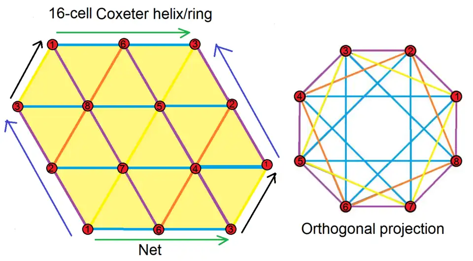 Um hexadecácoro pode ser construído a partir de hélices de Boerdijk–Coxeter de 8 cadeias de tetraedros, cada uma se dobrada se tornando um anel quadridimensional. As 16 faces triangulares podem ser vistas em uma planificação 2D em um mosaico triangular, com 6 triângulos ao redor de cada vértice. As arestas em roxo representam o Polígono de Petrie do hexadecácoro. [9][10]