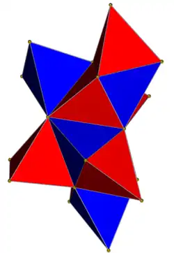 Há também um antiprisma tetraédrico que pode ser construído a partir de dois tetraedros paralelos em configuraç~eos duais, conectado com8 tetraedros. É representado por s{2,4,3}, e ![]()
