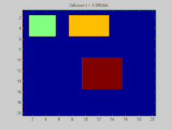 Este GIF mostra a progressão da difusão, conforme resolvido pela técnica laplaciana do grafo. Um grafo é construído sobre uma grade, onde cada pixel no grafo é conectado aos seus 8 pixels adjacentes. Os valores na imagem difundem-se então suavemente para os seus vizinhos ao longo do tempo através dessas conexões. Essa imagem em particular começa com três valores de pontos fortes que se espalham lentamente para os seus vizinhos. Todo o sistema acaba se estabelecendo com o mesmo valor em equilíbrio.
