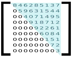 Exemplo de uma matriz triangular superior. Os elementos de valor maior que zero estão destacados em azul.
