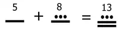 Adicionar e subtrair números abaixo de 20 usando numerais maias é muito simples. A adição é realizada combinando os símbolos numéricos em cada nível: