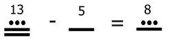 Se não houver pontos suficientes na posição do minuendo, uma barra é substituída por cinco pontos. Se não houver barras suficientes, um ponto é removido do próximo símbolo de minuendo mais alto na coluna e quatro barras são adicionadas ao símbolo de minuendo que está sendo trabalhado.