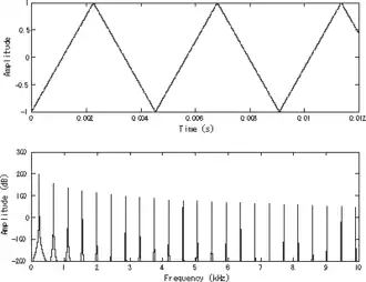 Como uma onda quadrada, a onda triangular contém apenas harmônicas ímpares. Entretanto, as harmônicas superiores se reduzem muito mais rapidamente do que em uma onda quadrada (proporcional ao inverso do quadrado do número hamônico ao invés de apenas ao inverso), e desse modo seu som é mais natural do que o de uma onda quadrada, sendo mais próximo do som da uma onda seno.