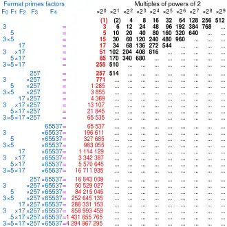 - , em que e são os primos de Fermat, ou seja, são números primos da forma , ; tal que , para quaisquer e .