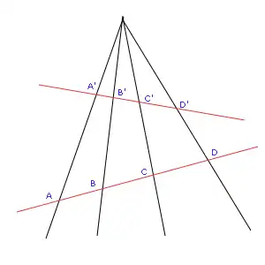 - A razão anarmônica é preservada por transformações projetivas. No caso, as razões anarmônicas são iguais: (A; B; C; D) = (A'; B'; C'; D')