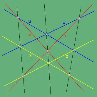 (3) os pontos equivalentes a intersecções de U com W, X com Z, e Y com V são colineares.