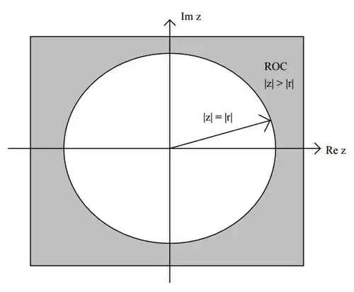 Portanto, a série converge absolutamente para todos os pontos do plano que se encontram fora do círculo de raio , centrado na origem. Esta região é denominada região de convergência (RDC ou ROC, da sigla em inglês Region of Convergence).