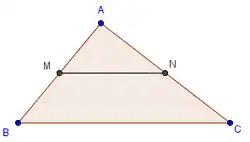 O teorema da base média do triângulo afirma que, dado um triângulo qualquer, o segmento com extremos nos pontos médios de dois lados desse triângulo é paralelo ao terceiro lado, e sua medida é igual a metade desse terceiro lado.[3]