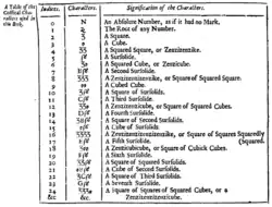 Samuel Jeake dá zenzizenzizenzizenzike (o quadrado do quadrado do quadrado do quadrado, ou 16º potência) em uma tabela em A Compleat Body of Arithmetick:[7]