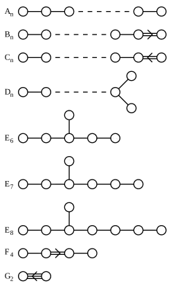 Toda álgebra de Lie semissimples sobre um corpo algebricamente fechado de característica 0 é uma soma direta de álgebras de Lie simples (por definição), e as álgebras de Lie simples de dimensão finita enquadram-se em quatro famílias – An, Bn, Cn e Dn – com cinco exceções E6, E7, E8, F4 e G2. As álgebras de Lie simples são classificadas pelos diagramas de Dynkin conexos, mostrados à direita, enquanto as álgebras de Lie semissimples correspondem a diagramas de Dynkin não necessariamente conexos, onde cada componente do diagrama corresponde a um termo na decomposição da álgebra de Lie semissimples em álgebras de Lie simples.