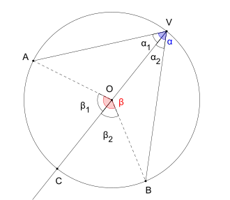As propriedades básicas dos ângulos inscritos são discutidas nas proposições 20-22 do livro 3 dos Elementos de Euclides[1]. Essas proposições garantem que o ângulo inscrito tem a metade da medida do ângulo central correspondente, que ângulos inscritos em um mesmo arco de uma corda são iguais e que a soma dos dois ângulos inscritos distintos correspondentes a uma determinada corda é 180°.