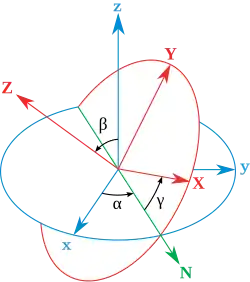 onde é o vetor posição no sistema ligado ao corpo e é o vetor posição no sistema inercial. A matriz de rotação descreve a orientação relativa dos dois sistemas. A matriz de rotação é definida pelo produto matricial de três rotações elementares descritas pelos ângulos de Euler α, β, γ: