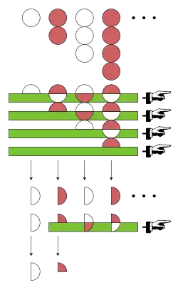 Em forma equivalente, podem-se reordenar as equações de forma tal para obter (s + s) + (s + s) = h + h= 1, o qual novamente implica que s= ¹⁄4; sendo esta a forma que é mostrada no esquema à direita e na expressão a seguir.