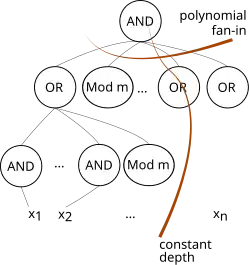 Mais formalmente, uma linguagem pertence a AC0 [m] se pode ser computada por uma família de circuitos C1, C2, ..., onde Cn possui n entradas, a profundidade de todos os circuitos é constante, o tamanho de Cn é uma função polinomial da variável n, e o circuito utiliza as seguintes portas: portas lógicas AND e portas lógicas OR com fator de carga de entrada irrestrita, calculando a conjunção e a disjunção das suas entradas; Porta lógica NOT computa a negação de sua única entrada; e fator de carga de entrada ilimitada em portas lógicas MOD-m, que computam 1 se o número de 1s na entrada é um múltiplo de m. Uma linguagem pertence a ACC0, se ele pertence a AC0[m] para algum m.