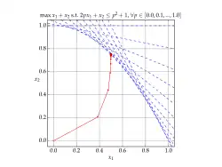 Isto é, existem 2 variáveis e 11 restrições associadas a diferentes valores de . Esta figura mostra a cada iteração do algoritmo, (pontos vermelho). As restrições são mostradas como linhas azuis.