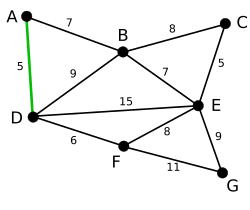 Agora duas arestas com peso 7 podem ser selecionadas e uma é escolhida ao acaso. A aresta BD é marcada pois forma um laço com as outras arestas já selecionadas. |