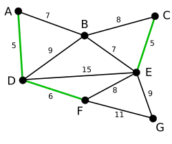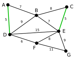 As arestas AD e CE são as mais leves do grafo e ambas podem ser selecionadas. É escolhido ao acaso AD. |