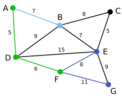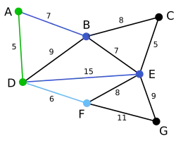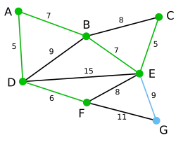 {DA, DF, AB, BE} | {A,B,D,F} | {B,C}= 8 {B,E}=7V {D,B}=9ciclo {D,E}=15 {F,E}=8 {F,G}=11 | {C,E,G} | Agora podemos escolher entre os vértices C, E, e G. C está a uma distância de 8 de B, E está a uma distância 7 de B e G está a 11 de F. E é o mais próximo do subgrafo e, portanto escolhemos a aresta BE. |