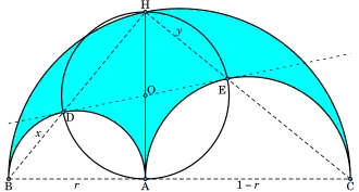 - Prova : Como ∠BDA é um ângulo reto, ∠DBA é igual a π/2 menos ∠DAB. Contudo, ∠DAH é igual a π/2 menos ∠DAB (já que ∠HAB é um ângulo reto). Logo, os triângulos DBA e DAH são similares. Com isso, ∠DIA é igual a ∠DOH, onde I é o ponto médio de BA e O é o ponto médio de AH. Mas ∠AOH é uma linha reta, então ∠DOH e ∠DOA são ângulos suplementares. Portanto a soma de ∠DIA e ∠DOA é π. ∠IAO é um ângulo reto. A soma dos ângulos em qualquer quadrilátero é 2π, então no quadrilátero IDOA, ∠IDO deve ser um ângulo reto. Mas ADHE é um retângulo, então o ponto médio O de AH (a diagonal do retângulo) também é o ponto médio de DE (a outra diagonal do retângulo). Como I (definido como o ponto médio de BA) é o centro do semicírculo BA, e o ângulo ∠IDE é um ângulo reto, então DE é tangente ao semicírculo BA em D. Por raciocínio análogo, DE é tangente ao semicírculo AC em E. Q.E.D.