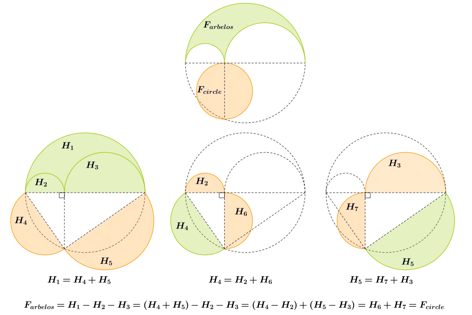 Prova: para a prova, reflita o arbelos sobre a linha através dos pontos B e C, observando que duas vezes a área do arbelos é o que sobra quando as áreas dos dois círculos menores (com diâmetros BA e AC) são subtraídos da área do círculo maior (com diâmetro BC). Já que á área do círculo é proporcional ao quadrado do diâmetro (Elementos de Euclides, Livro XII, Proposição 2; não precisamos saber que a constante de proporcionalidade é π/4), o problema se reduz a mostrar que . O comprimento |BC| é igual à soma dos comprimentos |BA| e |AC|, logo a equação se simplifica para . Logo, podemos afirmar que o comprimento do segmento AH é a média geométrica dos comprimentos dos segmentos BA and AC. Agora (ver figura abaixo) o triângulo BHC, sendo inscrito ao semicírculo, tem um ângulo reto no ponto H (Elementos, Livro III, Proposição 31), e consequentemente |HA| é de fato uma "média proporcional" entre |BA| e |AC| (Elementos, Livro VI, Proposição 8, Porisma). Esta prova aproxima o antigo argumento grego; Harold P. Boas cita um artigo de Roger B. Nelsen[3] que implementou a ideia como uma prova visual.[4]