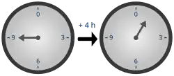 Um uso familiar da aritmética modular é no relógio de ponteiro, no qual o dia é dividido em dois períodos de 12 horas cada. Se são 7:00 agora, então 8 horas depois serão 3:00. A adição usual sugere que o tempo futuro deveria ser , mas o relógio "retrocede" a cada 12 horas. Da mesma forma, se o relógio começa em 12:00(meio-dia) e 21 horas passam, então a hora será 9:00 do dia seguinte, em vez de 33:00. Como o número de horas começa de novo depois que atinge 12, esta aritmética é chamada aritmética módulo 12. Em termos da definição abaixo, é congruente com módulo , então "15:00" em um relógio de 24 horas é exibido "3:00 "em um relógio de 12 horas.