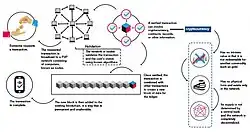 Blockchain é um tipo de base de dados distribuída[4] que guarda um registro de transações permanente e inviolável. A base de dados blockchain consiste em dois tipos de registros: transações individuais e blocos.