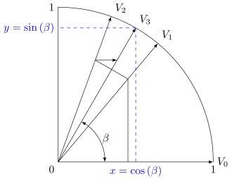 Na primeira iteração, esse vetor teria rodado 45° sentido anti-horário para ter o vetor . Sucessivas iterações rodarão o vetor em uma ou outra direção pelo tamanho dos passos decrescentes, até o ângulo desejado tenha sido alcançado. O tamanho da etapa i é arctan(1/(2i−1)) para i = 1, 2, 3, ….