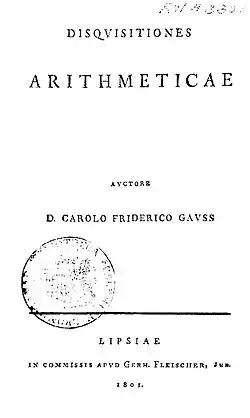 • 1801: Disquisitiones Arithmeticae (Latin). Uma tradução alemã por H. Maser Untersuchungen über höhere Arithmetik (Disquisitiones Arithmeticae & other papers on number theory) Second ed. New York: Chelsea. 1965. ISBN 978-0-8284-0191-3 , pp. 1–453. tradução para o inglês de Arthur A. Clarke Disquisitiones Arithmeticae Second, corrected ed. New York: Springer. 1986. ISBN 978-0-387-96254-2
