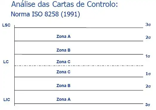 Segundo as regras da Norma ISO 8258 (1991), um processo encontra-se fora de controlo estatístico quando se verifica uma das situações seguintes:
