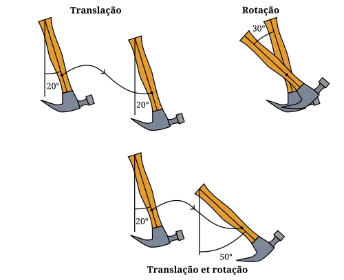 Na segunda e terceira parte na figura acima, o martelo rodou em relação a um eixo que permaneceu sempre perpendicular à página e perpendicular ao plano da translação na terceira parte. O eixo de rotação poderá não ser o mesmo em diferentes instantes e não ser perpendicular ao plano de translação.