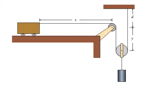 O movimento do carrinho pode ser descrito pela variação da distância horizontal até o eixo da roldana fixa. O movimento do cilindro será igual ao movimento da roldana móvel e, portanto, pode ser descrito pela expressão para a distância vertical entre os centros das roldanas, em função do tempo.[11]