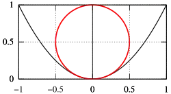 No vértice o raio de curvatura é igual a R (0) = 0,5 (veja a figura). A parábola tem contato de quarta ordem com seu círculo osculante. Para um t grande, o raio de curvatura aumenta ~ t 3, ou seja, a curva se endireita cada vez mais.
