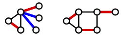 Uma cobertura mínima de arestas pode ser encontrada em tempo polinomial encontrando-se um acoplamento máximo e estendendo-a gulosamente, de modo que todos os vértices sejam cobertos. Na figura a seguir, um acoplamento máximo é marcado com vermelho; as arestas extras que foram adicionadas para cobrir nós não-acoplados são marcadas com azul. (A figura da direita mostra um grafo em que um acoplamento máximo é um acoplamento perfeito; daí que já cobre todos os vértices e nenhuma aresta extra é necessária.)