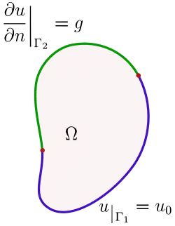 Por exemple, se u é uma solução para uma equação diferencial parcial em um conjunto Ω com contorno de trecho suave ∂Ω, e ∂Ω é dividido em duas partes, Γ₁ e Γ₂, um pode usar uma condição de contorno de Dirichlet em Γ₁ e uma condição de contorno de Neumann em Γ₂: