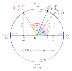 Multiplicando ambos os lados por , obtém-se . Em geral, existe uma forte correspondência entre pontos racionais no círculo unitário e os chamados ternos pitagóricos.[27]