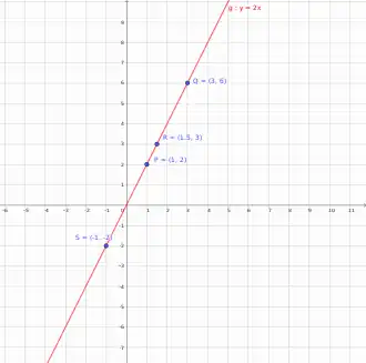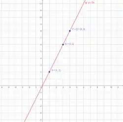 Devido ao fato de que duas grandezas, especificamente e , não são explicitamente nomeadas, espera-se um número maior de soluções. Como exemplo, podemos considerar o caso : soluções "completamente visíveis" nomeiam ambas as incógnitas, aqui por exemplo , ou . Somente a criação de duas dimensões – isto é, uma "dimensão x" e uma "dimensão y" – permite compreender este coletivo na sua totalidade (ver Imagem 1). Além disso, devido a , não se trata de nada mais do que uma listagem tabular de todos os pontos da forma .[1] Do ponto de vista geométrico, é natural designar a curva resultante como uma reta.
