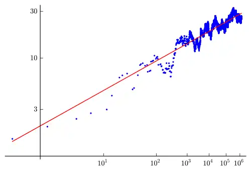 Representação (a azul) do logaritmo de para a curva elíptica baseada no eixo vertical, onde passa pelo primeiro milhão de números primos. No eixo horizontal está desenhado , de modo que a conjectura BSD prevê uma aproximação à reta desenhada a vermelho (inclinação igual ao posto da curva, aqui 1).