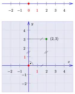 Eixo numérico (em cima), plano com coordenadas cartesianas (em baixo)