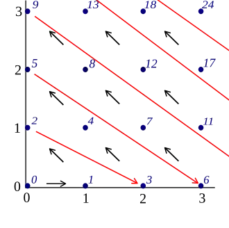 0 ↔ (0,0), 1 ↔ (1,0), 2 ↔ (0,1), 3 ↔ (2,0), 4 ↔ (1,1), 5 ↔ (0,2), 6 ↔ (3,0) ....
