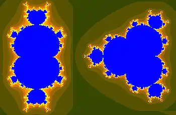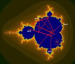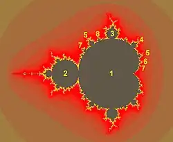 Dentro do conjunto de Mandelbrot, a iteração da sequência zn+1= zn²+c evolui de modo diferente para diferentes valores de c. Para valores de c no centro da grande cardióide, as iterações convergem para um ponto. Para valores de c dentro do grande bolbo à esquerda do cardióide, as iterações convergem para um ciclo de período 2. Para os outros bolbos, as iterações convergem para ciclos com diferentes períodos, de acordo com o número mostrado na figura seguinte.