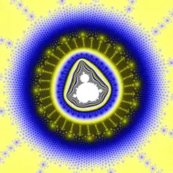 Quando se explora o Conjunto de Mandelbrot com mais resolução (fazendo «zoom») encontram-se sempre réplicas e mais réplicas do conjunto ad infinitum. É uma característica dos objectos fractais. Só a limitada precisão das computações possíveis faz com que, a partir de certa altura, isso deixe de acontecer.