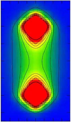 Um quark e um antiquark (em vermelho) são mantidos grudados (em verde) formando um méson (resultado de simulação da QCD na rede por by M. Cardoso et al.[12])