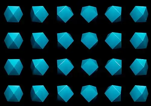 O Poliedro dual do cuboctaedro é o Dodecaedro rômbico. A forma intermediária entre um octaedro e um cubo é um cuboctaedro. Os pontos de um encaixe icosaédrico são os mesmo que aqueles do cuboctaedro.[2]