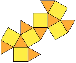 Um cuboctaedro é um poliedro com 8 faces triangulares e 6 faces quadrangulares. O cuboctaedro pode não ser realizado, considerando os pontos médios das arestas e unindo esses pontos por uma aresta, se eles pertencerem a arestas adjacentes de uma face do cubo; mas também pode ser obtido a partir do octaedro, o dual do cubo, considerado como arestas os segmentos que unem os pontos médios dos lados das faces triangulares do octaedro.[1]